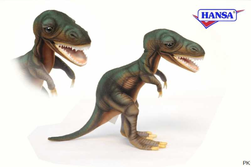 Plüsch Tyrannosaurus in aufrechter Position: er läuft auf zwei kräftigen Beinen, der Oberkörper ist nach vorn geneigt. Der Körper des Plueschtier Tyrannosaurus ist recht massiv gebaut. Pluesch Tyrannosaurus mit kurzem, muskulösen Hals, großem Kopf und langen, sägeblattartigen und "gefährlichen" Zähnen.
