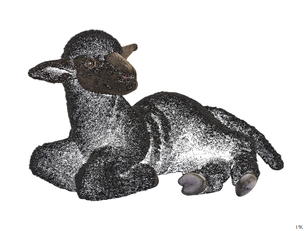 Plüschtier Lamm mit weicher, schwarzer Wolle, das Gesicht, die Ohren und die Pfoten sind grau abgesetzt. Das Stofftier Lamm hat einen schmalen Kopf, große schwarze Knopfaugen und kleine, zur Seite gerichtete, spitze Ohren. Das Kuscheltier Lamm liegt auf seinen vier Pfoten. Größe Plüsch Lamm: 33 cm