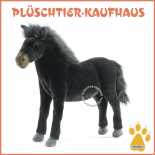 Plüschtier Pferd in stehender Position, mit vollständig schwarzem Fell, am Nacken, am Schopf und am Schwanz Langhaare. Die Hufen des Plüschtier Pferd sind dunkelgrau abgesetzt.