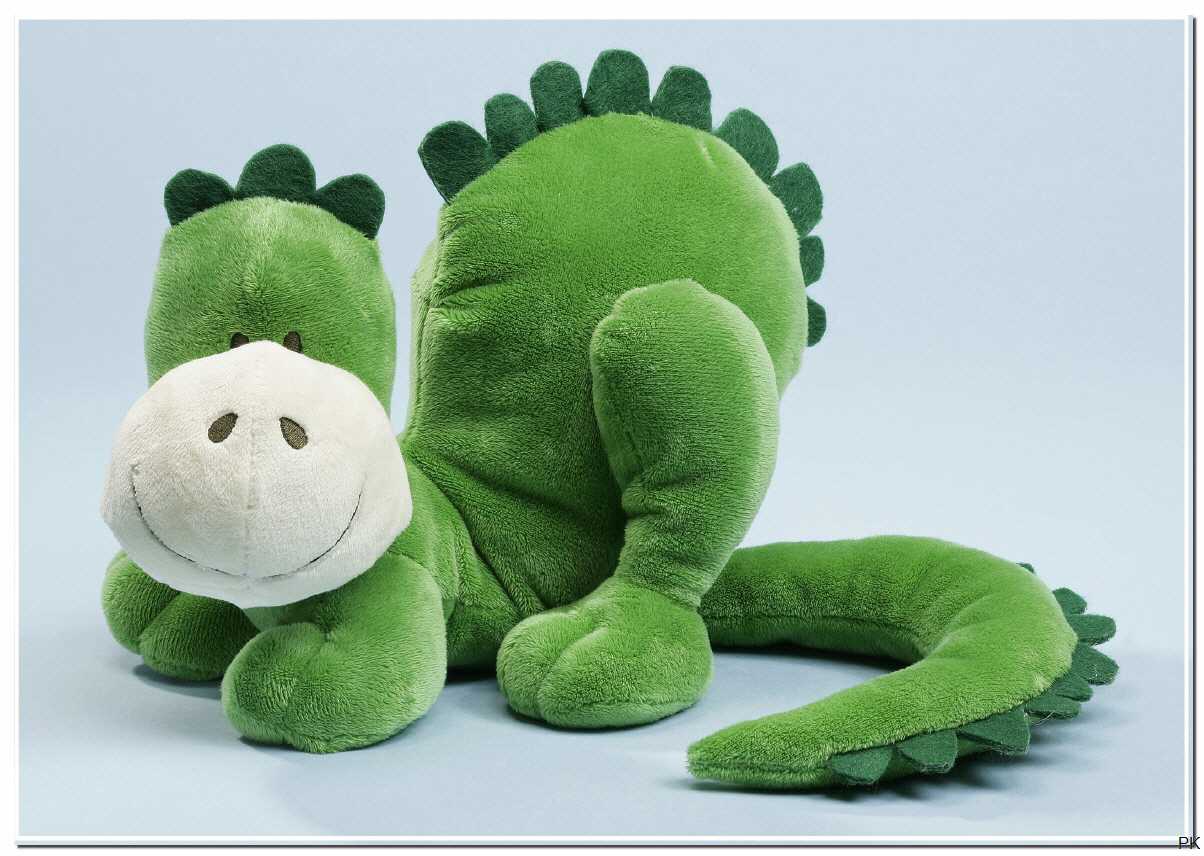 Plüsch Drache Farbe: grün in stehender Position mit seitlichem Blick aus Softvelour mit dunkelgrünen Filzzacken 25 cm groß