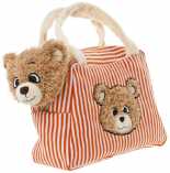 PlüschtascheTeddybärmit Teddybärkopf aus hochwertig verarbeitetem Curly-Material, weichgefüllt mit Beanbags. Die Plüschtasche ist aus gestreiftem Trikot-Stoff. Größe Plüschtasche Teddybär: 19 cm Farbe Plüschtasche Teddybär: hellbraun, rot, weiß