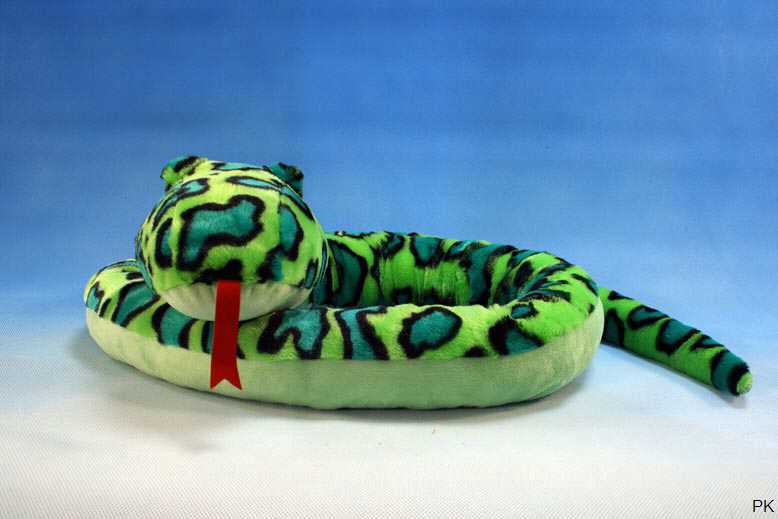 Plüschtier Schlange aus hochwertig verarbeitetem Plüschmaterial. Das Kuscheltier Schlange ist grün gefärbt, mit türkis/schwarzen Flecken.Größe Kuscheltier Schlange: 250 cm