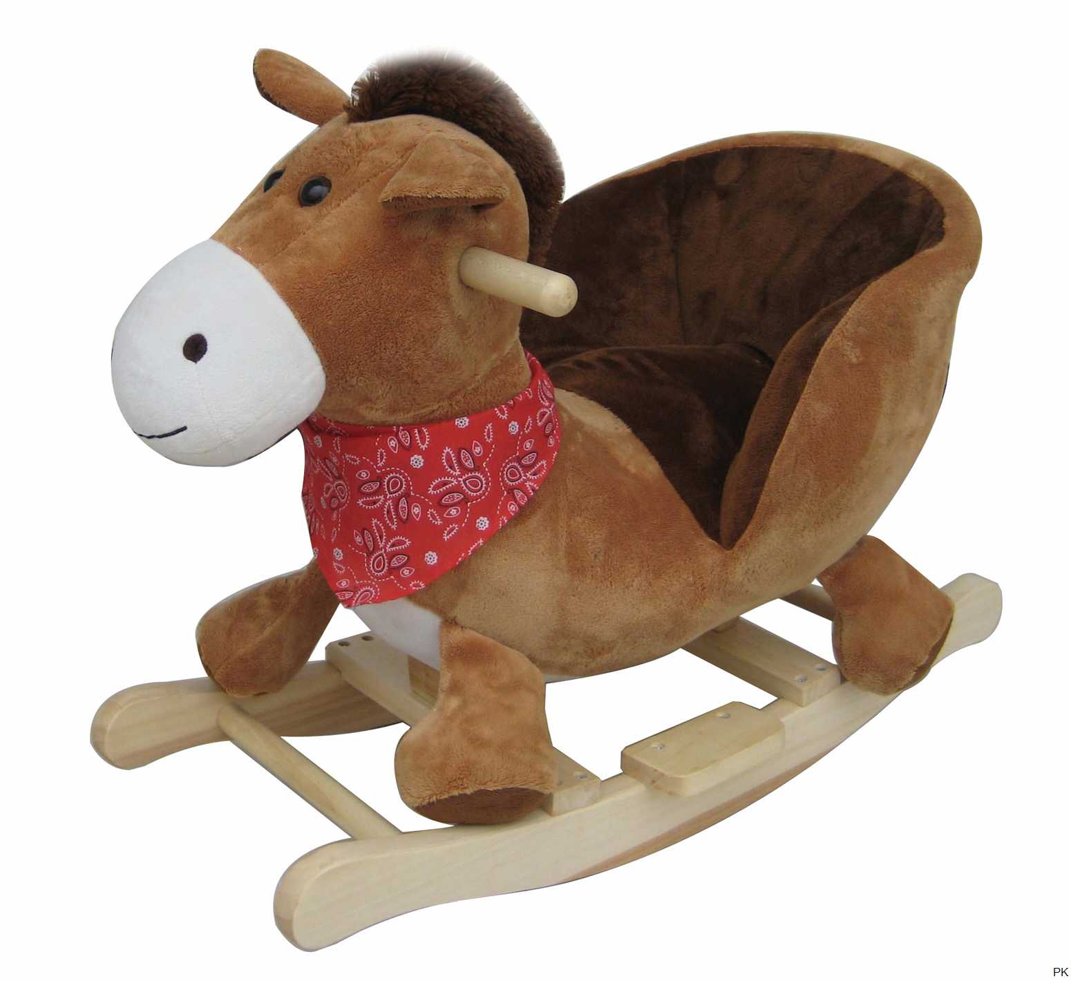 Schaukelpferd aus hochwertig verarbeitetem, strapazierfähigem Plüschmaterial, mit kuschelweicher Füllung, antiallergisch und schwer entflammbar. Das Schaukelpferd ist bekleidet mit einem Halstuch.